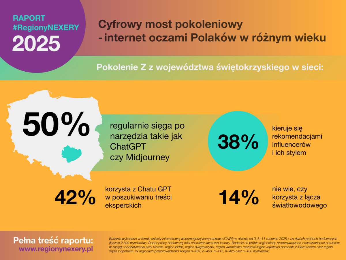 Raport #RegionyNEXERY to coroczna publikacja przygotowywana przez firmę Nexera we współpracy z K+Research. Od 2019 roku badanie dostarcza szczegółowych danych na temat cyfrowych zachowań mieszkańców Polski i regionów objętych siecią światłowodową Nexery, obejmujących województwa: kujawsko-pomorskie, mazowieckie, łódzkie, opolskie, śląskie, świętokrzyskie oraz warmińsko-mazurskie. Najnowsza publikacja zatytułowana “Cyfrowy most pokoleniowy - internet oczami Polaków w różnym wieku” koncentruje się na analizie aktywności internautów w różnych grupach wiekowych, ich postaw wobec nowych technologii, w tym sztucznej inteligencji oraz na poziomie zaufania do informacji dostępnych w sieci, co umożliwia kompleksowe zrozumienie cyfrowych trendów. Perspektywa generacyjna pozwala uchwycić kontrasty i lepiej zrozumieć cyfrowe zachowania Polaków.