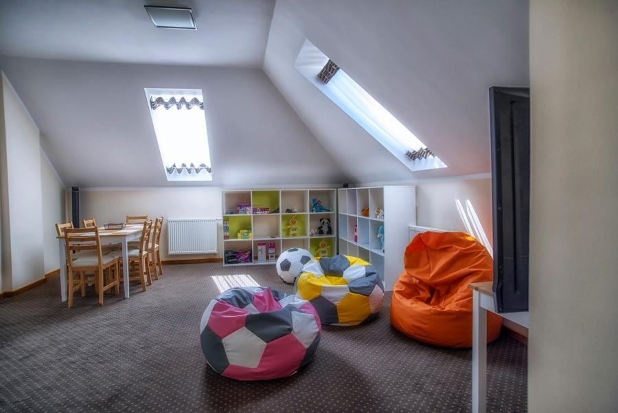 • Dla dzieci oferujemy plac zabaw z piaskownicą, huśtawkami, zjeżdżalnią, liną tyrolką, domkiem, siatką wspinaczkową. Pokój zabaw z grami rodzinnymi, miejscem do oglądania bajek, rysowania i innych zabaw.